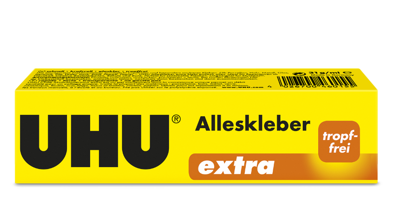 UHU Alleskleber EXTRA • Füllmenge: 31 g • klebt Filz, Glas, Holz, Leder, Metall, Pappe, Papier, Textilien, Styropor®. • tropffrei, auswaschbar, schnell trocknend • Farbe: klar